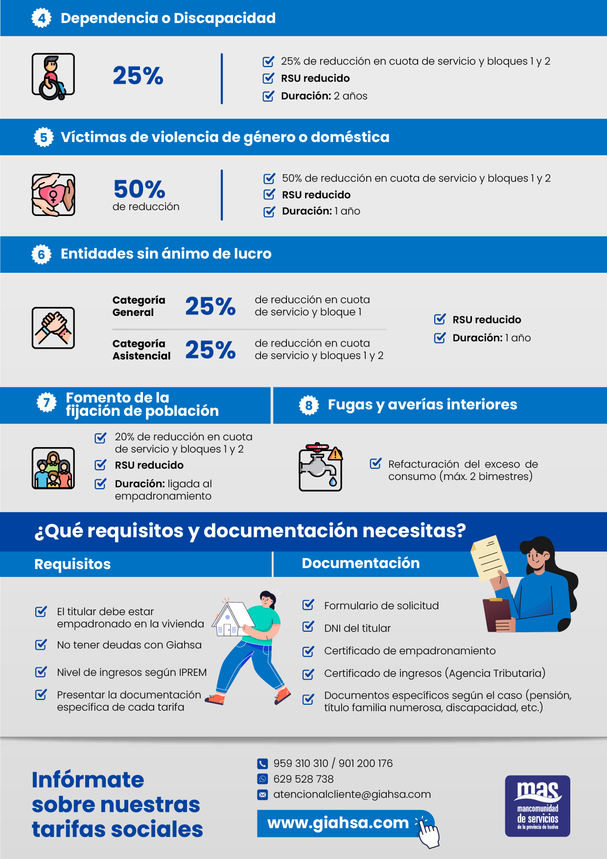 Debe solicitarlo el titular del suministro doméstico, que deberá estar empadronado en esa vivienda. El usuario para el que se acredite una dependencia en Grado II o Grado III o un grado de discapacidad igual o superior al 33%, deberá estar empadronado en la vivienda. El nivel conjunto de ingresos de todas las personas empadronadas debe ser inferior a dos veces el Indicador Público de Renta de Efectos Múltiples (IPREM) y ni el titular ni el resto de las personas empadronadas podrán ser titulares de otro contrato de suministro en vigor ni tener deudas vencidas con Giahsa.