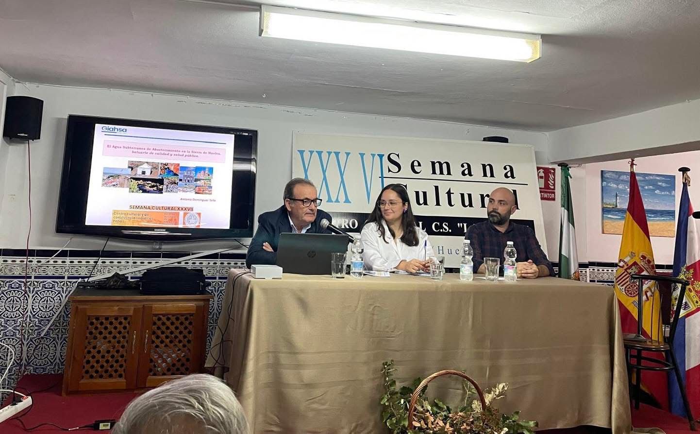 Aroche, 29 de octubre de 2025.- El gerente de Giahsa, Juan Manuel González Padilla, participó en la 37ª Semana Cultural de Aroche con la ponencia titulada “El agua subterránea de abastecimiento en la Sierra de Huelva. Baluarte de calidad y salud pública”, un evento en el que también estuvieron presentes expertos relacionados con el conocimiento, la cultura y el medio ambiente.