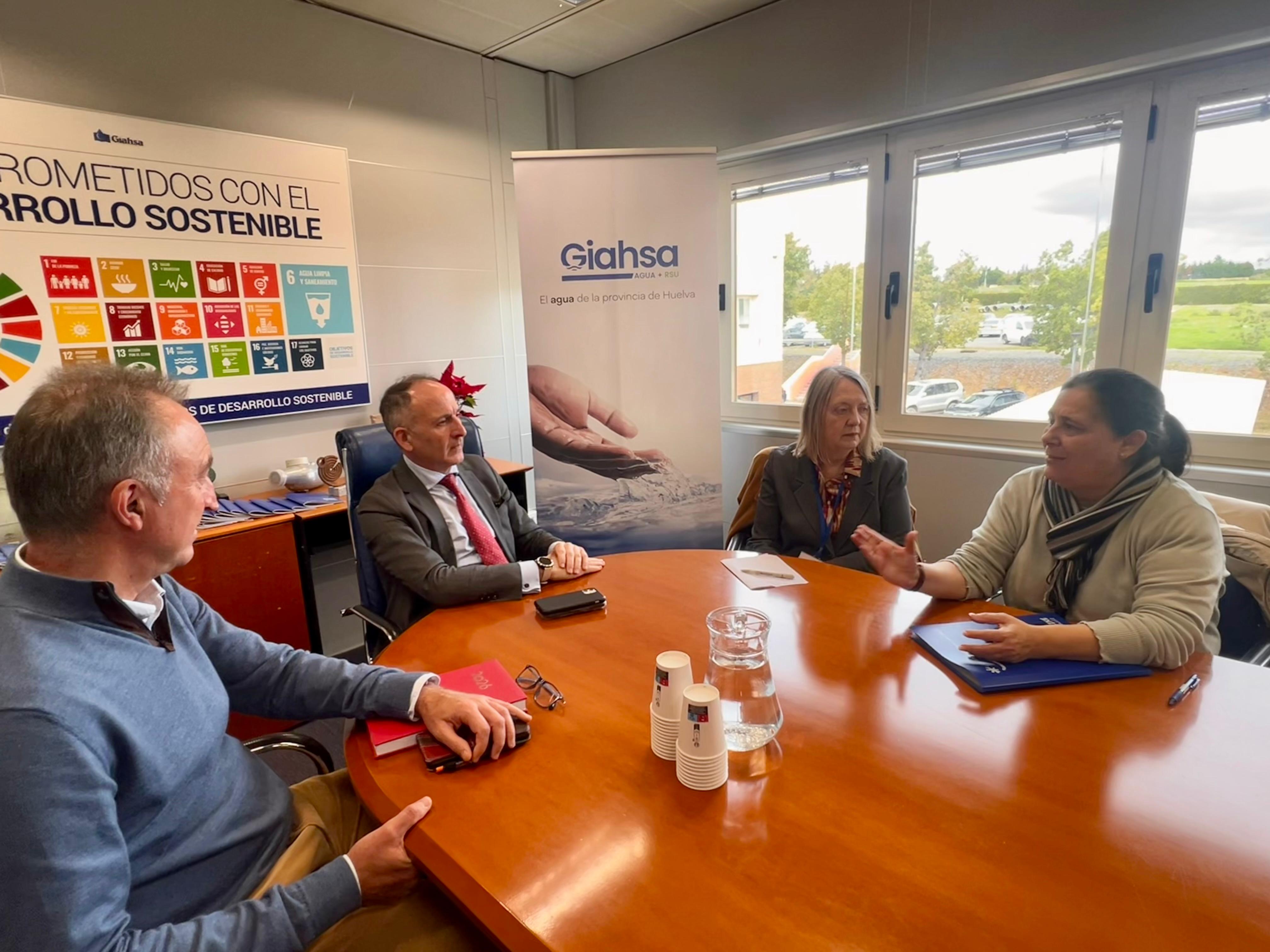 Aljaraque, 10 de marzo de 2026.- La presidenta de Aguas de las Cuencas de España (ACUAES), Mª Rosa Cobo, ha mantenido una reunión de trabajo con el director ejecutivo y el subdirector de Proyectos de Giahsa, Santiago Ponce y Modesto Pereira, respectivamente, con el objetivo de seguir avanzando en el desarrollo de nuevas actuaciones en materia de saneamiento, depuración y reutilización de agua en la provincia de Huelva.